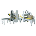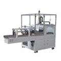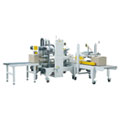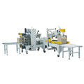 袋裝全自動裝箱機開箱機預先開始工作,將紙箱開箱成型,同時膠帶粘貼到紙箱..