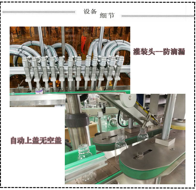 2、采用防高泡產品的灌裝升降系統、雙重防滴漏與拉絲的灌裝悶頭、確保瓶口定位的液位控制和定位系統。